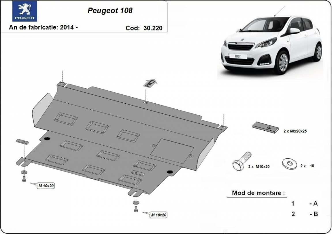 El cubre carter metalico es nuevo y se adapta perfectamente al Peugeot 108, con las siguientes versiones de motor / accionamiento: toate, fabricado entre 2014 y 2021. La placa protega los siguientes: motor, caja de cambios, radiador Está preparado de chapa de Acero de 2 mm. Cerrojos, calces y todos los accesorios incluidos. Todas las placas son estrachadas con pintura de polvo anticorrosivo. Las placas del protección del motor son equipados con braceares soldados para resistir mejor a los impactos exteriores. |