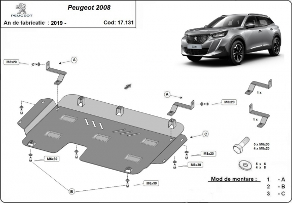 El cubre carter metalico es nuevo y se adapta perfectamente al Peugeot 2008, con las siguientes versiones de motor / accionamiento: toate, fabricado entre 2019 y 2026. La placa protega los siguientes: motor, caja de cambios, radiador Está preparado de chapa de Acero de 2 mm. Cerrojos, calces y todos los accesorios incluidos. Todas las placas son estrachadas con pintura de polvo anticorrosivo. Las placas del protección del motor son equipados con braceares soldados para resistir mejor a los impactos exteriores. |