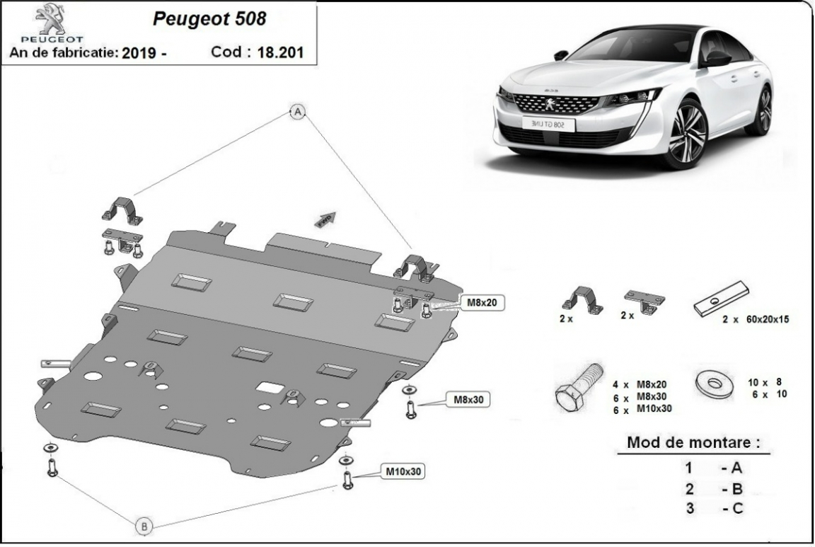 El cubre carter metalico es nuevo y se adapta perfectamente al Peugeot 508, con las siguientes versiones de motor / accionamiento: toate, fabricado entre 2018 y 2026. La placa protega los siguientes: motor, caja de cambios, radiador, parachoques delantero, subchasis Está preparado de chapa de Acero de 2 mm. Cerrojos, calces y todos los accesorios incluidos. Todas las placas son estrachadas con pintura de polvo anticorrosivo. Las placas del protección del motor son equipados con braceares soldados para resistir mejor a los impactos exteriores. |