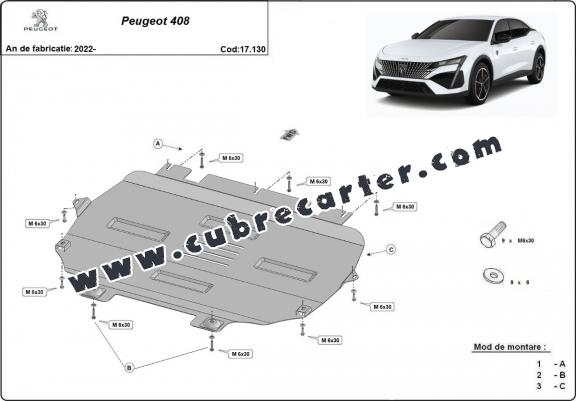 El cubre carter metalico es nuevo y se adapta perfectamente al Peugeot 408, con las siguientes versiones de motor / accionamiento: toate, fabricado entre 2022 y 2025. La placa protega los siguientes: motor, caja de cambios, radiador Está preparado de chapa de Acero de 2 mm. Cerrojos, calces y todos los accesorios incluidos. Todas las placas son estrachadas con pintura de polvo anticorrosivo. Las placas del protección del motor son equipados con braceares soldados para resistir mejor a los impactos exteriores. |