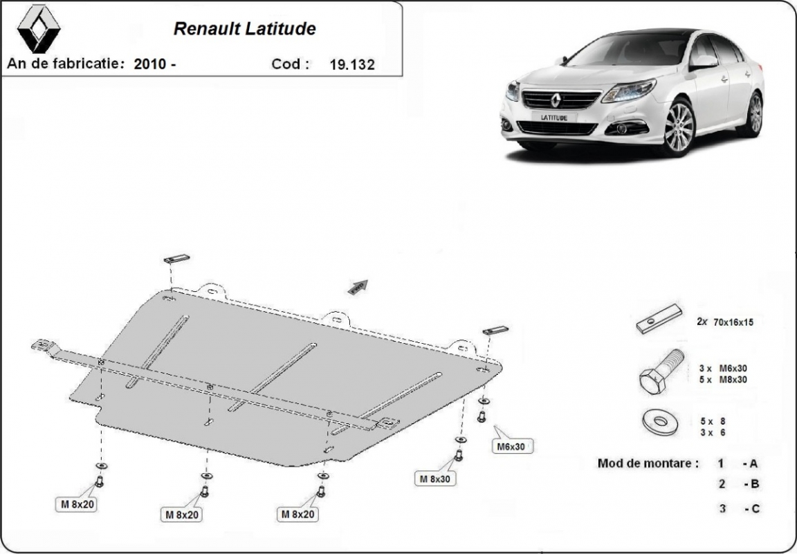 El cubre carter metalico es nuevo y se adapta perfectamente a todas las versiones de Renault Latitude fabricadas entre 2010 y 2015. La placa protega los siguientes: motor, caja de cambios, radiador Está preparado de chapa de Acero de 2 mm. Cerrojos, calces y todos los accesorios incluidos. Todas las placas son estrachadas con pintura de polvo anticorrosivo. Las placas del protección del motor son equipados con braceares soldados para resistir mejor a los impactos exteriores. |