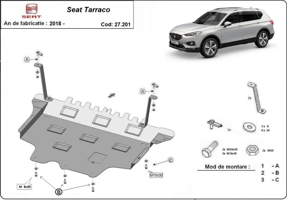El cubre carter metalico es nuevo y se adapta perfectamente al Seat Tarraco, con las siguientes versiones de motor / accionamiento: toate, fabricado entre 2018 y 2024. La placa protega los siguientes: motor, caja de cambios, radiador, parachoques delantero Está preparado de chapa de Acero de 2 mm. Cerrojos, calces y todos los accesorios incluidos. Todas las placas son estrachadas con pintura de polvo anticorrosivo. Las placas del protección del motor son equipados con braceares soldados para resistir mejor a los impactos exteriores. |