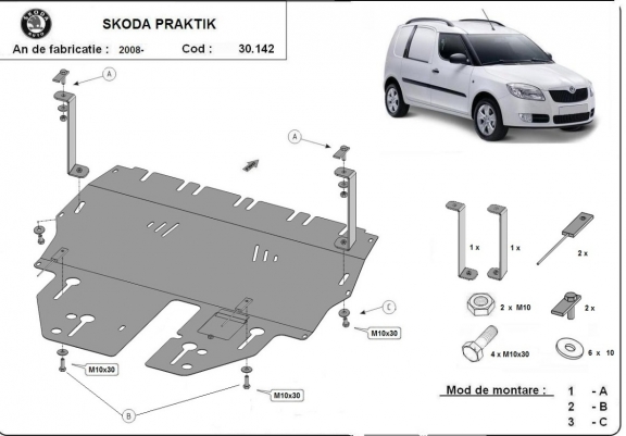 El cubre carter metalico es nuevo y se adapta perfectamente al Skoda Praktik, con las siguientes versiones de motor / accionamiento: toate, fabricado entre 2006 y 2015. La placa protega los siguientes: motor, caja de cambios, radiador, parachoques delantero Montada con salida de petróleo descendido así que no es necesario el cambio del petróleo cuando se quita la placa. Está preparado de chapa de Acero de 2 mm. Cerrojos, calces y todos los accesorios incluidos. Todas las placas son estrachadas con pintura de polvo anticorrosivo. Las placas del protección del motor son equipados con braceares soldados para resistir mejor a los impactos exteriores. |