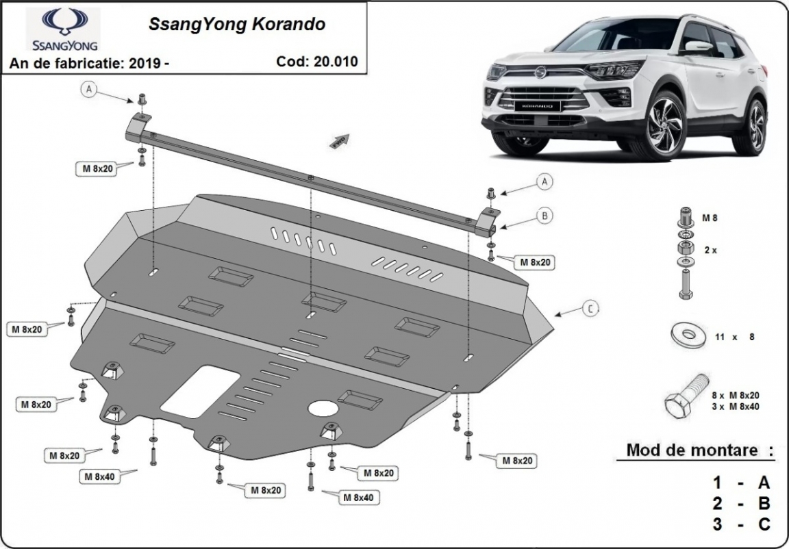 El cubre carter metalico es nuevo y se adapta perfectamente al SsangYong Korando, con las siguientes versiones de motor / accionamiento: toate, fabricado entre 2019 y 2026. La placa protega los siguientes: motor, caja de cambios, radiador Está preparado de chapa de Acero de 2 mm. Cerrojos, calces y todos los accesorios incluidos. Todas las placas son estrachadas con pintura de polvo anticorrosivo. Las placas del protección del motor son equipados con braceares soldados para resistir mejor a los impactos exteriores. |