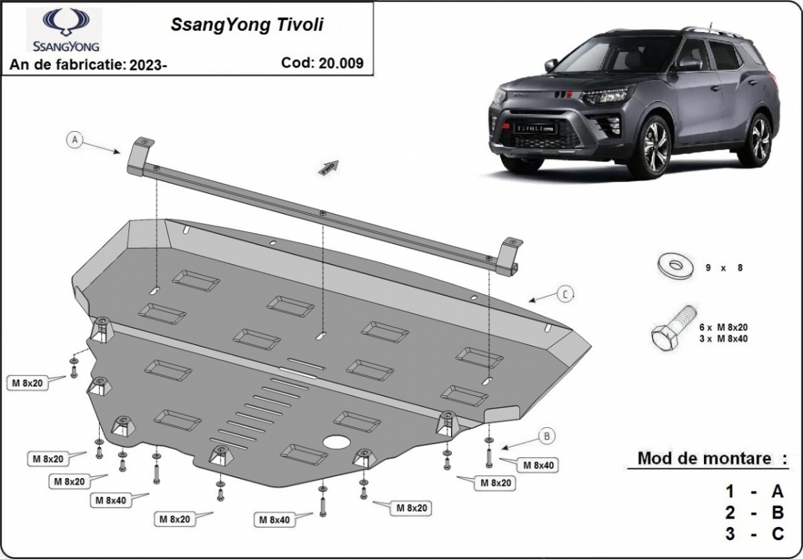 El cubre carter metalico es nuevo y se adapta perfectamente al SsangYong Tivoli, con las siguientes versiones de motor / accionamiento: toate, fabricado entre 2023 y 2026. La placa protega los siguientes: motor, caja de cambios, radiador Está preparado de chapa de Acero de 2 mm. Cerrojos, calces y todos los accesorios incluidos. Todas las placas son estrachadas con pintura de polvo anticorrosivo. Las placas del protección del motor son equipados con braceares soldados para resistir mejor a los impactos exteriores. |