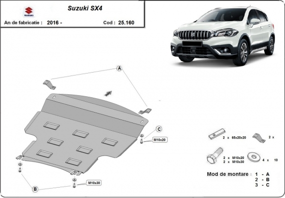 El cubre carter metalico es nuevo y se adapta perfectamente al Suzuki SX4, con las siguientes versiones de motor / accionamiento: toate, fabricado entre 2013 y 2023. La placa protega los siguientes: motor, caja de cambios Está preparado de chapa de Acero de 2 mm. Cerrojos, calces y todos los accesorios incluidos. Todas las placas son estrachadas con pintura de polvo anticorrosivo. Las placas del protección del motor son equipados con braceares soldados para resistir mejor a los impactos exteriores. |