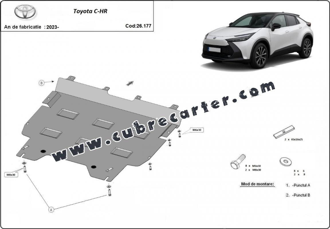 El cubre carter metalico es nuevo y se adapta perfectamente al Toyota C-HR, con las siguientes versiones de motor / accionamiento: toate, fabricado entre 2023 y 2025. La placa protega los siguientes: motor, caja de cambios, radiador Está preparado de chapa de Acero de 2 mm. Cerrojos, calces y todos los accesorios incluidos. Todas las placas son estrachadas con pintura de polvo anticorrosivo. Las placas del protección del motor son equipados con braceares soldados para resistir mejor a los impactos exteriores. |