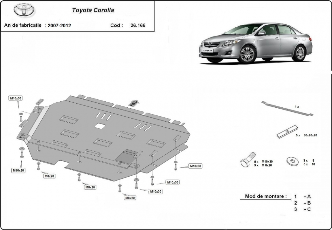 El cubre carter metalico es nuevo y se adapta perfectamente al Toyota Corolla, con las siguientes versiones de motor / accionamiento: toate, fabricado entre 2007 y 2012. La placa protega los siguientes: motor Montada con salida de petróleo descendido así que no es necesario el cambio del petróleo cuando se quita la placa. Está preparado de chapa de Acero de 2 mm. Cerrojos, calces y todos los accesorios incluidos. Todas las placas son estrachadas con pintura de polvo anticorrosivo. Las placas del protección del motor son equipados con braceares soldados para resistir mejor a los impactos exteriores. |