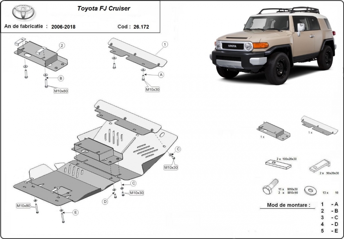El cubre carter metalico es nuevo y se adapta perfectamente al Toyota Fj Cruiser, con las siguientes versiones de motor / accionamiento: toate, fabricado entre 2006 y 2018. La placa protega los siguientes: motor, radiador, parachoques delantero Está preparado de chapa de Acero de 2.5 mm. Cerrojos, calces y todos los accesorios incluidos. Todas las placas son estrachadas con pintura de polvo anticorrosivo. Las placas del protección del motor son equipados con braceares soldados para resistir mejor a los impactos exteriores. |