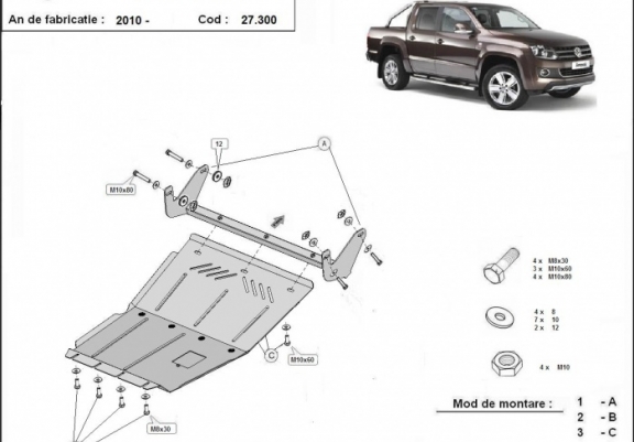 El cubre carter metalico es nuevo y se adapta perfectamente al Volkswagen Amarok, con las siguientes versiones de motor / accionamiento: 2.0L, 3.0L, fabricado entre 2010 y 2022. La placa protega los siguientes: motor Montada con salida de petróleo descendido así que no es necesario el cambio del petróleo cuando se quita la placa. Está preparado de chapa de Acero de 3 mm. Cerrojos, calces y todos los accesorios incluidos. Todas las placas son estrachadas con pintura de polvo anticorrosivo. Las placas del protección del motor son equipados con braceares soldados para resistir mejor a los impactos exteriores. |