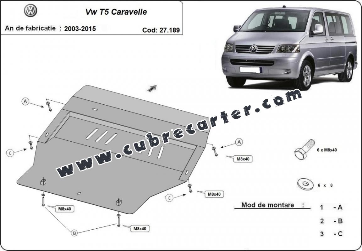 El cubre carter metalico es nuevo y se adapta perfectamente al Volkswagen Caravelle T5, con las siguientes versiones de motor / accionamiento: , fabricado entre 2005 y 2017. La placa protega los siguientes: motor, caja de cambios, radiador, parachoques delantero Está preparado de chapa de Acero de 2 mm. Cerrojos, calces y todos los accesorios incluidos. Todas las placas son estrachadas con pintura de polvo anticorrosivo. Las placas del protección del motor son equipados con braceares soldados para resistir mejor a los impactos exteriores. |