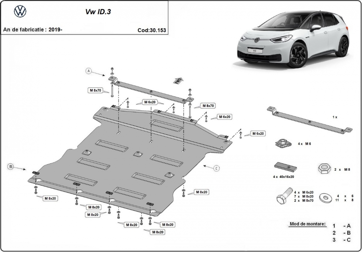 El cubre carter metalico es nuevo y se adapta perfectamente a todas las versiones de Volkswagen ID 3 fabricadas entre 2019 y 2026. La placa protega los siguientes: motor, caja de cambios, radiador Está preparado de chapa de Acero de 2 mm. Cerrojos, calces y todos los accesorios incluidos. Todas las placas son estrachadas con pintura de polvo anticorrosivo. Las placas del protección del motor son equipados con braceares soldados para resistir mejor a los impactos exteriores. |