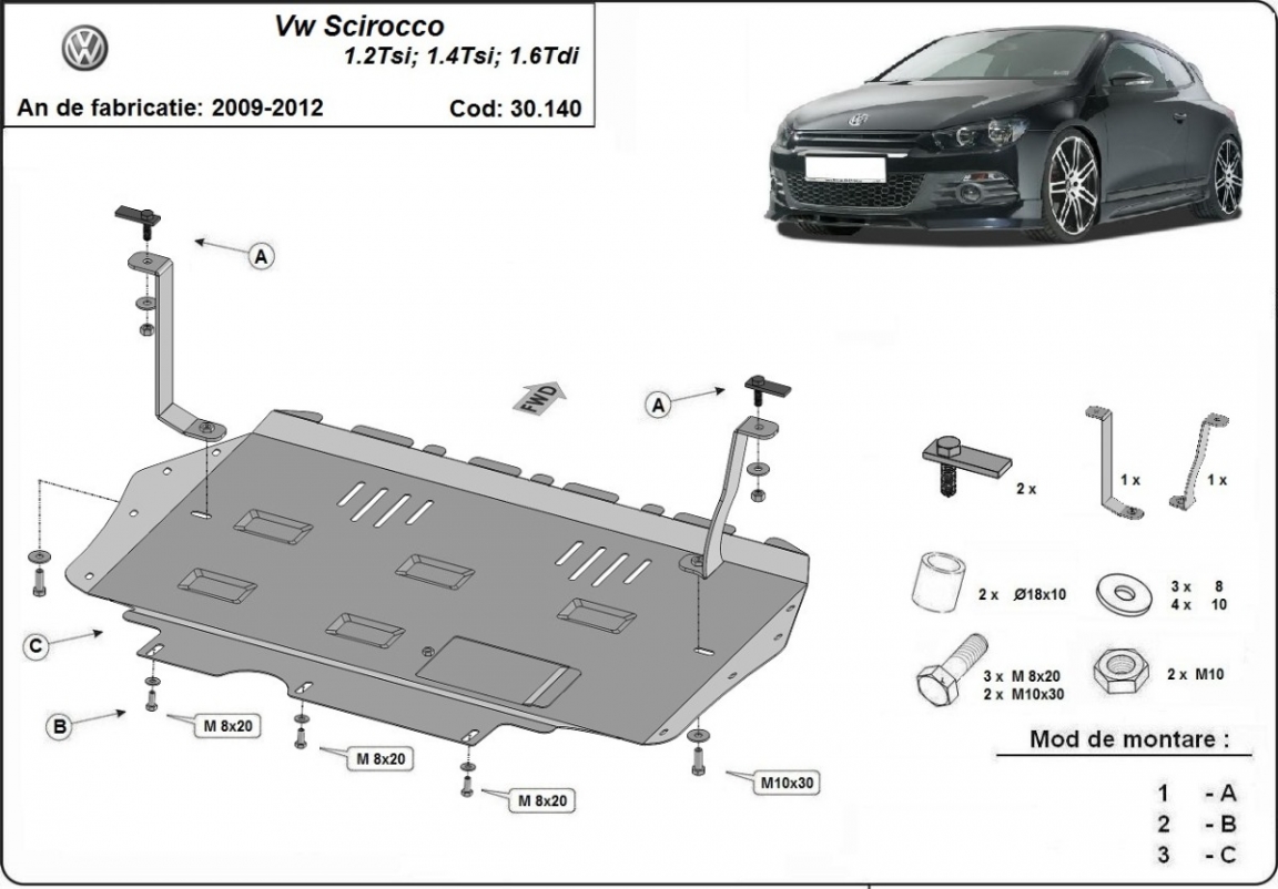 El cubre carter metalico es nuevo y se adapta perfectamente al Volkswagen Scirocco, con las siguientes versiones de motor / accionamiento: 1.2,2.0TSI, 2.0TDI, fabricado entre 2008 y 2017. La placa protega los siguientes: motor, caja de cambios, radiador Montada con salida de petróleo descendido así que no es necesario el cambio del petróleo cuando se quita la placa. Está preparado de chapa de Acero de 2 mm. Cerrojos, calces y todos los accesorios incluidos. Todas las placas son estrachadas con pintura de polvo anticorrosivo. Las placas del protección del motor son equipados con braceares soldados para resistir mejor a los impactos exteriores. |