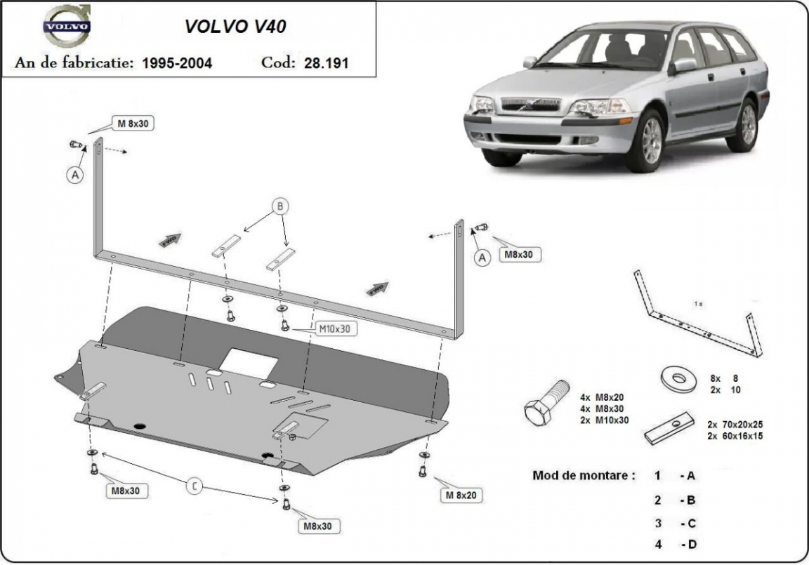 El cubre carter metalico es nuevo y se adapta perfectamente al Volvo V40, con las siguientes versiones de motor / accionamiento: toate, fabricado entre 1995 y 2004. La placa protega los siguientes: motor, caja de cambios Montada con salida de petróleo descendido así que no es necesario el cambio del petróleo cuando se quita la placa. Está preparado de chapa de Acero de 2 mm. Cerrojos, calces y todos los accesorios incluidos. Todas las placas son estrachadas con pintura de polvo anticorrosivo. Las placas del protección del motor son equipados con braceares soldados para resistir mejor a los impactos exteriores. |