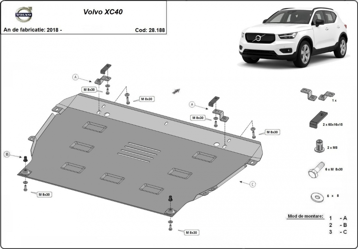 El cubre carter metalico es nuevo y se adapta perfectamente a todas las versiones de Volvo XC40 fabricadas entre 2018 y 2026. La placa protega los siguientes: motor, caja de cambios, radiador Está preparado de chapa de Acero de 2 mm. Cerrojos, calces y todos los accesorios incluidos. Todas las placas son estrachadas con pintura de polvo anticorrosivo. Las placas del protección del motor son equipados con braceares soldados para resistir mejor a los impactos exteriores. |