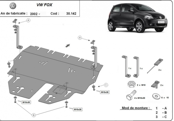 El cubre carter metalico es nuevo y se adapta perfectamente al VW Fox, con las siguientes versiones de motor / accionamiento: toate, fabricado entre 2002 y 2017. La placa protega los siguientes: motor, caja de cambios, radiador, parachoques delantero Montada con salida de petróleo descendido así que no es necesario el cambio del petróleo cuando se quita la placa. Está preparado de chapa de Acero de 2 mm. Cerrojos, calces y todos los accesorios incluidos. Todas las placas son estrachadas con pintura de polvo anticorrosivo. Las placas del protección del motor son equipados con braceares soldados para resistir mejor a los impactos exteriores. |