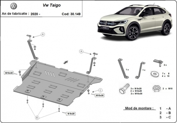 El cubre carter metalico es nuevo y se adapta perfectamente al VW Taigo, con las siguientes versiones de motor / accionamiento: toate, fabricado entre 2020 y 2026. La placa protega los siguientes: motor, caja de cambios, radiador, parachoques delantero Está preparado de chapa de Acero de 2 mm. Cerrojos, calces y todos los accesorios incluidos. Todas las placas son estrachadas con pintura de polvo anticorrosivo. Las placas del protección del motor son equipados con braceares soldados para resistir mejor a los impactos exteriores. |