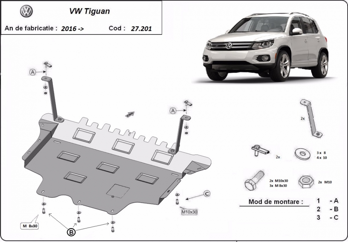 El cubre carter metalico es nuevo y se adapta perfectamente a todas las versiones de VW Tiguan fabricadas entre 2016 y 2024. La placa protega los siguientes: motor, caja de cambios, radiador, parachoques delantero Montada con salida de petróleo descendido así que no es necesario el cambio del petróleo cuando se quita la placa. Está preparado de chapa de Acero de 2 mm. Cerrojos, calces y todos los accesorios incluidos. Todas las placas son estrachadas con pintura de polvo anticorrosivo. Las placas del protección del motor son equipados con braceares soldados para resistir mejor a los impactos exteriores. |