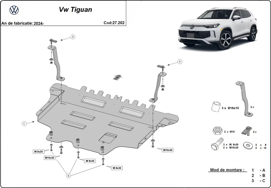 El cubre carter metalico es nuevo y se adapta perfectamente al VW Tiguan, con las siguientes versiones de motor / accionamiento: non-hybrid, fabricado entre 2024 y 2026. La placa protega los siguientes: motor, caja de cambios, radiador Está preparado de chapa de Acero de 2 mm. Cerrojos, calces y todos los accesorios incluidos. Todas las placas son estrachadas con pintura de polvo anticorrosivo. Las placas del protección del motor son equipados con braceares soldados para resistir mejor a los impactos exteriores. |