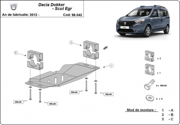 El cubre carter metalico es nuevo y se adapta perfectamente al Dacia Dokker, con las siguientes versiones de motor / accionamiento: 1.5 diesel, fabricado entre 2012 y 2026. La placa protega los siguientes: EGR, system STOP&GO Está preparado de chapa de Acero de 1.5 mm. Cerrojos, calces y todos los accesorios incluidos. Todas las placas son estrachadas con pintura de polvo anticorrosivo. Las placas del protección del motor son equipados con braceares soldados para resistir mejor a los impactos exteriores. |