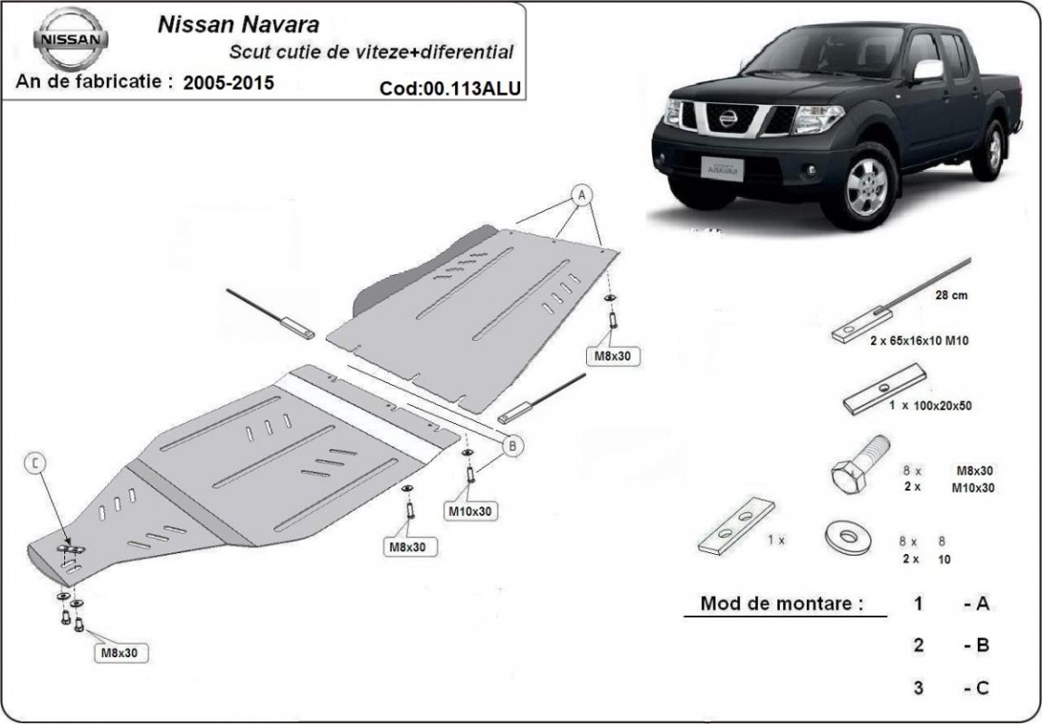 El cubre carter metalico es nuevo y se adapta perfectamente a todas las versiones de Nissan Navara fabricadas entre 2005 y 2015. La placa protega los siguientes: caja de cambios, caja de transferencia Está preparado de chapa de Aluminio de 4 mm. Los escudos son de aluminio, pero los soportes de fijación son de acero. Cerrojos, calces y todos los accesorios incluidos. Todas las placas son estrachadas con pintura de polvo anticorrosivo. Las placas del protección del motor son equipados con braceares soldados para resistir mejor a los impactos exteriores. |