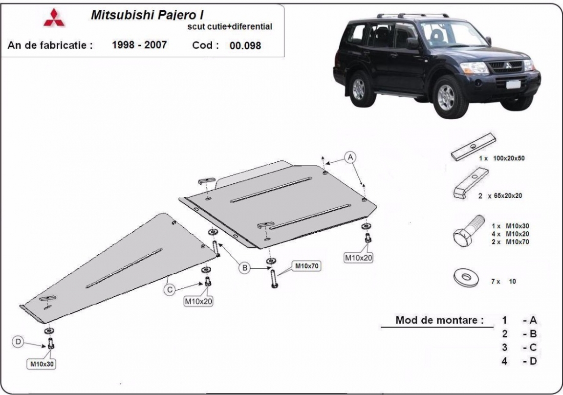 El cubre carter metalico es nuevo y se adapta perfectamente al Mitsubishi Montero Sport 1, con las siguientes versiones de motor / accionamiento: , fabricado entre 1998 y 2007. La placa protega los siguientes: caja de cambios, diferencial Está preparado de chapa de Acero de 3 mm. Cerrojos, calces y todos los accesorios incluidos. Todas las placas son estrachadas con pintura de polvo anticorrosivo. Las placas del protección del motor son equipados con braceares soldados para resistir mejor a los impactos exteriores. |