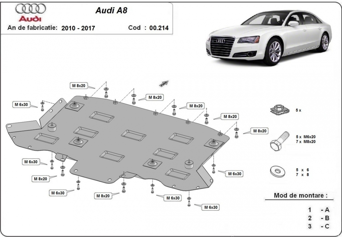 El cubre carter metalico es nuevo y se adapta perfectamente al Audi A8, con las siguientes versiones de motor / accionamiento: toate, fabricado entre 2010 y 2017. La placa protega los siguientes: caja de cambios Está preparado de chapa de Acero de 2 mm. Cerrojos, calces y todos los accesorios incluidos. Todas las placas son estrachadas con pintura de polvo anticorrosivo. Las placas del protección del motor son equipados con braceares soldados para resistir mejor a los impactos exteriores. |