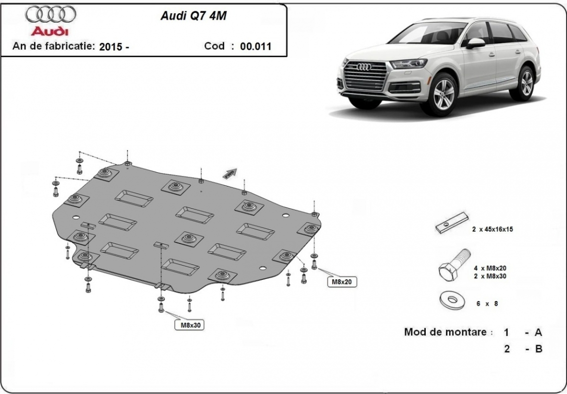 El cubre carter metalico es nuevo y se adapta perfectamente al Audi Q7, con las siguientes versiones de motor / accionamiento: toate, fabricado entre 2015 y 2026. La placa protega los siguientes: caja de cambios Está preparado de chapa de Acero de 2 mm. Cerrojos, calces y todos los accesorios incluidos. Todas las placas son estrachadas con pintura de polvo anticorrosivo. Las placas del protección del motor son equipados con braceares soldados para resistir mejor a los impactos exteriores. |