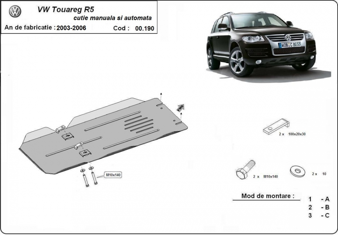 El cubre carter metalico es nuevo y se adapta perfectamente al VW Touareg 7L, con las siguientes versiones de motor / accionamiento: toate, fabricado entre 2003 y 2006. La placa protega los siguientes: caja de cambios Está preparado de chapa de Acero de 3 mm. Cerrojos, calces y todos los accesorios incluidos. Todas las placas son estrachadas con pintura de polvo anticorrosivo. Las placas del protección del motor son equipados con braceares soldados para resistir mejor a los impactos exteriores. |