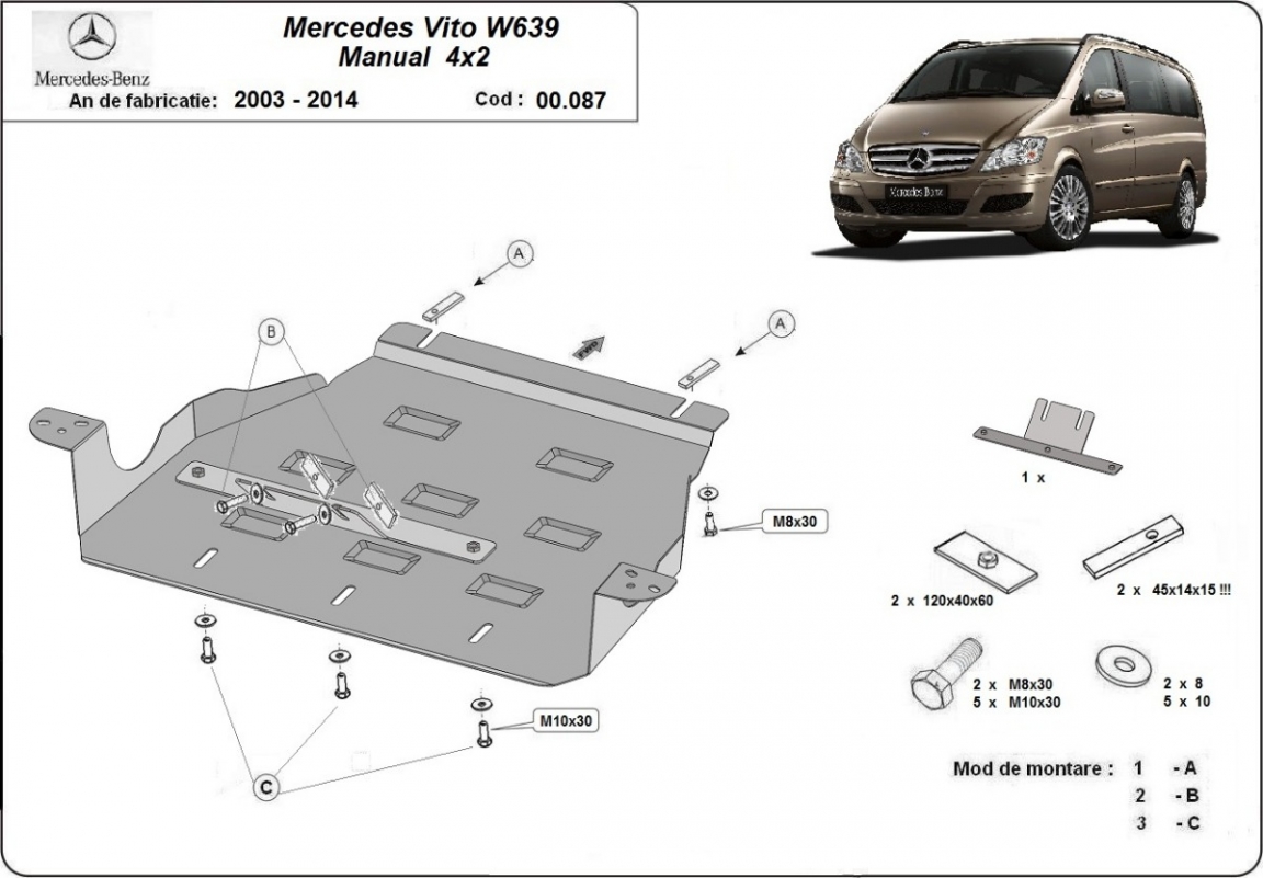 El cubre carter metalico es nuevo y se adapta perfectamente al Mercedes Viano, con las siguientes versiones de motor / accionamiento: 2.2 D 4x2, fabricado entre 2003 y 2014. La placa protega los siguientes: caja de cambios Está preparado de chapa de Acero de 2 mm. Cerrojos, calces y todos los accesorios incluidos. Todas las placas son estrachadas con pintura de polvo anticorrosivo. Las placas del protección del motor son equipados con braceares soldados para resistir mejor a los impactos exteriores. |