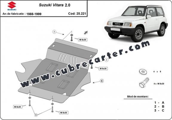 El cubre carter metalico es nuevo y se adapta perfectamente al Suzuki Vitara, con las siguientes versiones de motor / accionamiento: 2.0 petrol, fabricado entre 1988 y 1999. La placa protega los siguientes: caja de cambios, caja de transferencia Está preparado de chapa de Acero de 2.5 mm. Cerrojos, calces y todos los accesorios incluidos. Todas las placas son estrachadas con pintura de polvo anticorrosivo. Las placas del protección del motor son equipados con braceares soldados para resistir mejor a los impactos exteriores. |