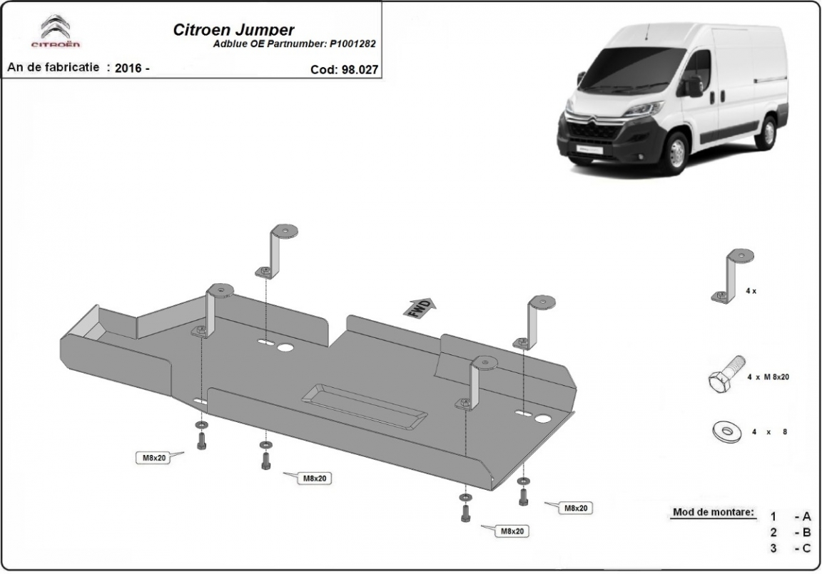El cubre carter metalico es nuevo y se adapta perfectamente al Citroen Jumper, con las siguientes versiones de motor / accionamiento: toate, fabricado entre 2016 y 2026. La placa protega los siguientes: depósito de combustible AdBlue Está preparado de chapa de Acero de 2 mm. Cerrojos, calces y todos los accesorios incluidos. Todas las placas son estrachadas con pintura de polvo anticorrosivo. Las placas del protección del motor son equipados con braceares soldados para resistir mejor a los impactos exteriores. |