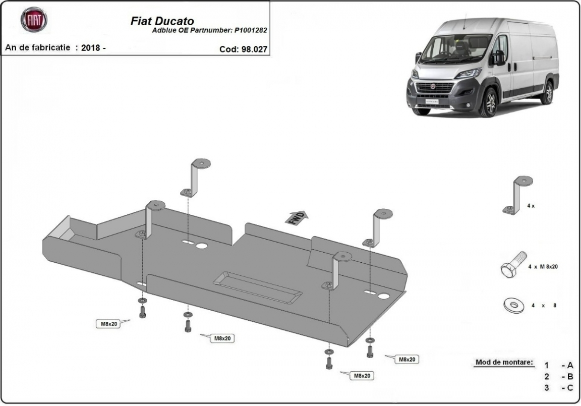 El cubre carter metalico es nuevo y se adapta perfectamente al Fiat Ducato, con las siguientes versiones de motor / accionamiento: toate, fabricado entre 2018 y 2026. La placa protega los siguientes: depósito de combustible AdBlue Está preparado de chapa de Acero de 2 mm. Cerrojos, calces y todos los accesorios incluidos. Todas las placas son estrachadas con pintura de polvo anticorrosivo. Las placas del protección del motor son equipados con braceares soldados para resistir mejor a los impactos exteriores. |