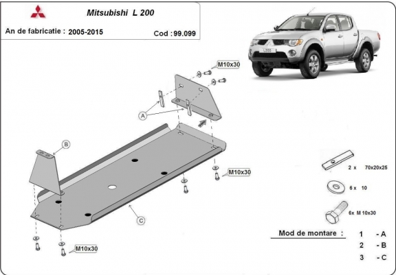 El cubre carter metalico es nuevo y se adapta perfectamente a todas las versiones de Mitsubishi L 200 fabricadas entre 2005 y 2015. La placa protega los siguientes: depósito de combustible Está preparado de chapa de Acero de 2,5 mm. Cerrojos, calces y todos los accesorios incluidos. Todas las placas son estrachadas con pintura de polvo anticorrosivo. Las placas del protección del motor son equipados con braceares soldados para resistir mejor a los impactos exteriores. |