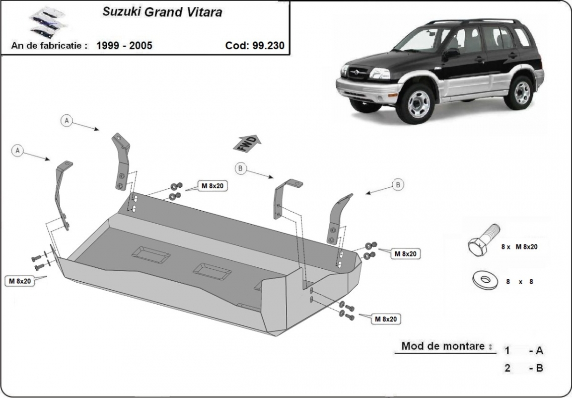 El cubre carter metalico es nuevo y se adapta perfectamente al Suzuki Grand Vitara, con las siguientes versiones de motor / accionamiento: toate, fabricado entre 1999 y 2005. La placa protega los siguientes: depósito de combustible Está preparado de chapa de Acero de 2 mm. Cerrojos, calces y todos los accesorios incluidos. Todas las placas son estrachadas con pintura de polvo anticorrosivo. Las placas del protección del motor son equipados con braceares soldados para resistir mejor a los impactos exteriores. |