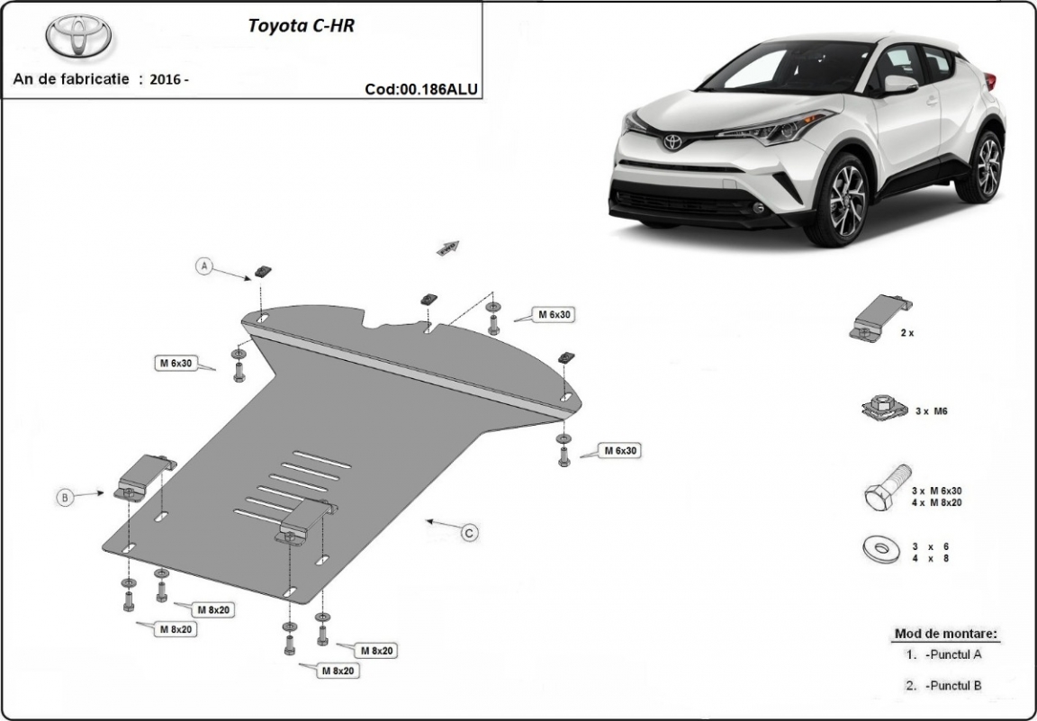 El cubre carter metalico es nuevo y se adapta perfectamente a todas las versiones de Toyota C-HR fabricadas entre 2016 y 2023. La placa protega los siguientes: Conversor catalítico Está preparado de chapa de Aluminio de 3 mm. Los escudos son de aluminio, pero los soportes de fijación son de acero. Cerrojos, calces y todos los accesorios incluidos. Todas las placas son estrachadas con pintura de polvo anticorrosivo. Las placas del protección del motor son equipados con braceares soldados para resistir mejor a los impactos exteriores. |